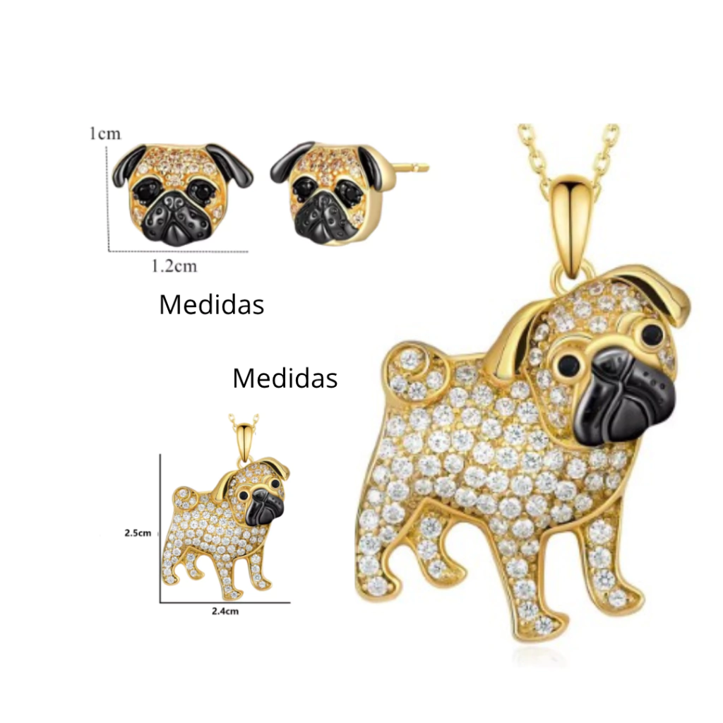 El dije (2.4 × 2.5 cm) y los aretes (1 × 1.2 cm), elaborados en acero dorado y adornados con circonitas ✨, capturan la ternura y elegancia de esta raza tan querida.
